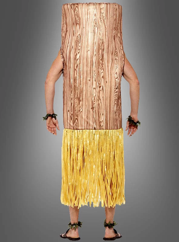 Das Tiki Kostüm ist eine bedruckte Tunika mit angenähtem Bastrock. Der obere Teil der Tunika ist mit Schaumstoff gepolstert, so dass diese bequem sitzt und auch bei wilden Tänzen nicht verrutscht. Ebenfalls als Schutz vor dem Verrutschen dient ein schwarzer Kragen, durch den Ihr Kopf an Ort und Stelle bleibt. Der Druck des Kostüms ist einem Holzpfahl mit aufgemaltem Totem-Gesicht nachempfunden. Der gelbe Bastrock ist aus Kunststoff.