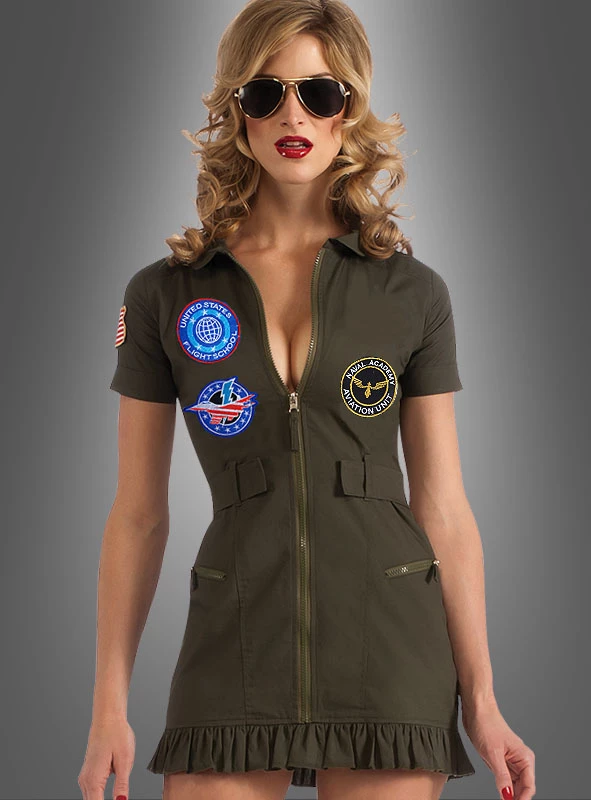 Das Kostüm besteht aus einem sexy Kleid mit Reißverschluss vorne. Den Reißverschluss können Sie ganz schließen oder provozierend offen tragen. An den Ärmeln und im Brustbereich sind gestickte Patches mit Navy und Flieger Motiven aufgenäht. Die Motive der Patches können variiieren.