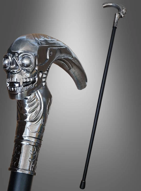 Der massive Gehstock mit Totenkopf ist bis ins Detail wunderschön gestaltet. Mit einer Länge von ca. 93 cm rundet er jegliche Arten von Kostümen ab. Den Griff bildet ein metallischer Totenkopf, welcher detailliert gearbeitet ist und durch die silbern-glänzende Farbe besonders stylisch wirkt. Der Handgriff passt perfekt in die Hand und bietet somit einen stabilen Halt. Ein Gummipuffer dämpft den Aufprall auf Asphalt und lässt den edlen Spazierstock noch hochwertiger aussehen.