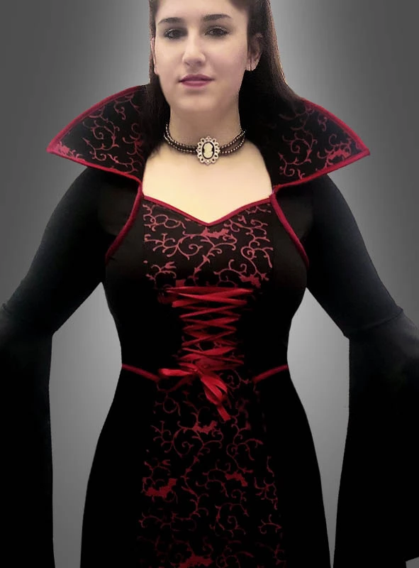 Das bodenlange Vampirin Kostüm für Damen ist A-förmig geschnitten und aus bequemem schwarzem Stoff mit roten Ranken gefertigt. Zwischen dem Muster sind kleine Fledermäuse zu sehen. Im Brustbereich befindet sich eine dekorative Schnürung, die zur Zierde angebracht ist. Der große Stehkragen ist für besseren Stand mit Schaumstoff gepolstert. Die weiten Trompetenärmel lassen das Vampir Kleid für Frauen besonders imposant und erhaben erscheinen. Ebenfalls im Lieferumfang enthalten ist das schmückende Halsband mit Cameo Medaillon und den Perlen. Für einen Auftritt mit Biss ist somit alles enthalten, was Sie für die Verkleidung brauchen. Allerdings sollten Sie sich noch als Vampirin schminken. Denn bleiche Haut und blutunterlaufene Augen machen Sie erst wirklich zum Wesen der Nacht. Natürlich finden Sie das passende Makeup zum Vampir schminken ebenfalls bei uns im Onlineshop.