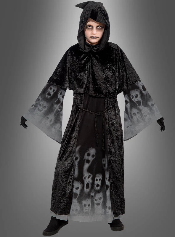 Mit dieser schwarzen Robe bist du der Gebieter über unzählige vergessene Seelen. Das Halloweenkostüm für Jungs oder Mädchen mit den vielen Geistergesichtern sieht so richtig gruselig aus.