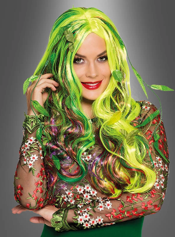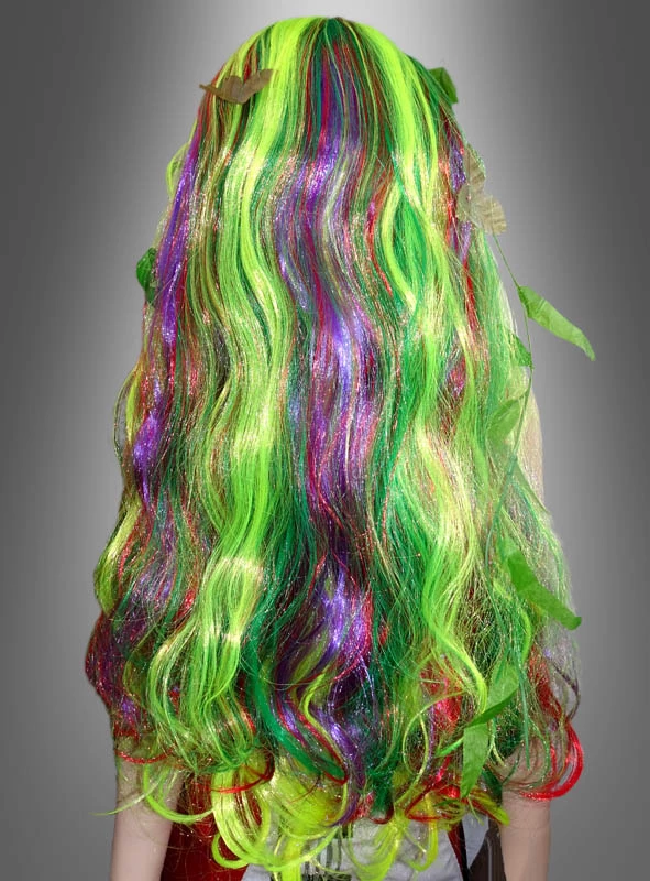 Die Waldfee Perücke mit den sehr langen Haaren leuchtet in hellem Neon Gelb. Unter diesem Deckhaar schauen viele Strähnchen in den Farben grün, lila und rot hervor. Auf der zweiten Produktabbildung sind die Farben schön zu erkennen. An der Perücke sind verschiedene Blätter einzeln und als Ranke angebracht. Sie passt dadurch wunderbar zu Feen, Elfen und Kräuterhexen Kostümen. Aber auch als Meerjungfrau und zu anderen fantastischen Cosplays sieht diese Langhaarperücke einfach umwerfend aus.
