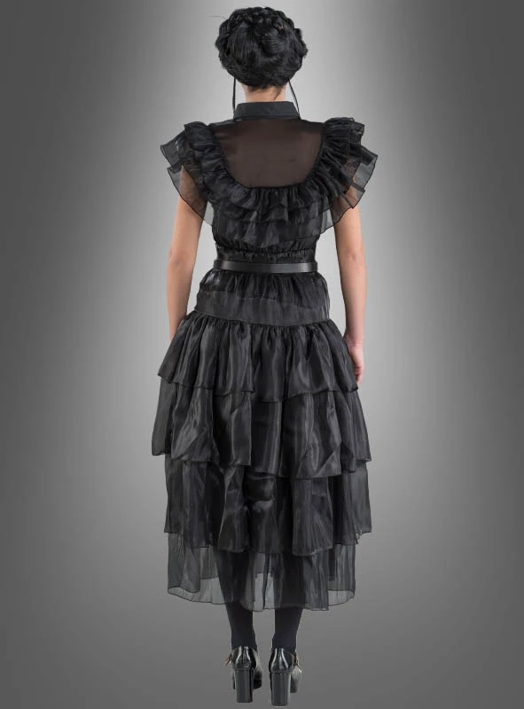 Düster schwarz aber elegant und einfach schön ist das Wednesday Kostüm für den Schulball. Das lange schwarze Kleid ist bestückt mit mehreren Volants aus Tüll. Auch der Ausschnitt ist mit Tüll verziert. In diesem Ballkleid für Damen sind Sie der Star auf dem Ball der Nevermore Academy. Der Gürtel ist ebenfalls im Lieferumfang.