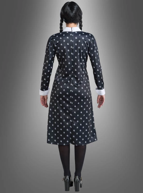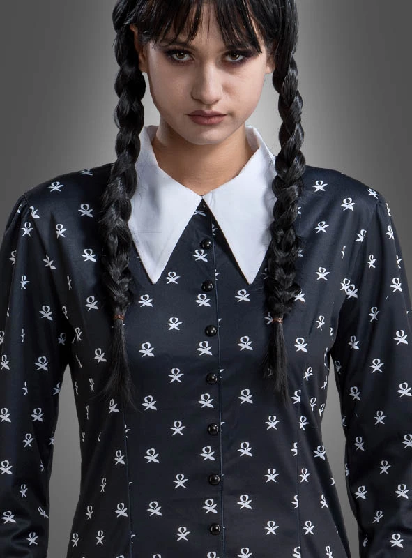 Der große, spitze Kragen ist ganz typisch für das Wednesday Kostüm. Dazu passend sind die breiten, weißen Manschetten am Ärmelabschluss angenäht. Die lange Knopfleiste vorne verziert das Damenkostüm wunderbar. Gemustert ist das schwarze Kleid mit einem feinen Muster aus weißen, abstrakten Blumen, die auch stilistische Totenköpfe sein könnten.