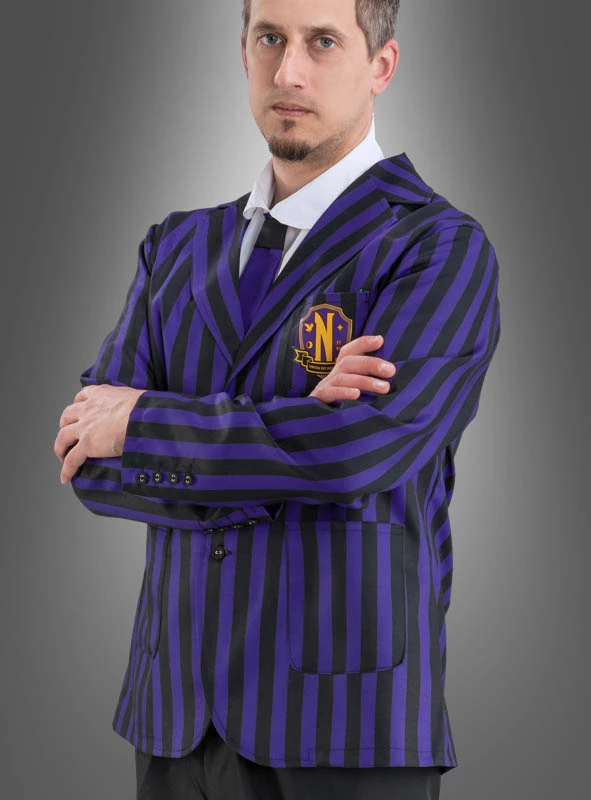 Das Wednesday Kostüm als Schuluniform für Herren besteht aus einem schwarz-lila gestreiftem Jackett. Das Wappen der Nevermore Academy ist auf der Brusttasche zu sehen. Der weiße Hemdeinsatz mit der Krawatte wird darunter getragen. Mit dabei ist auch die schwarze Hose.