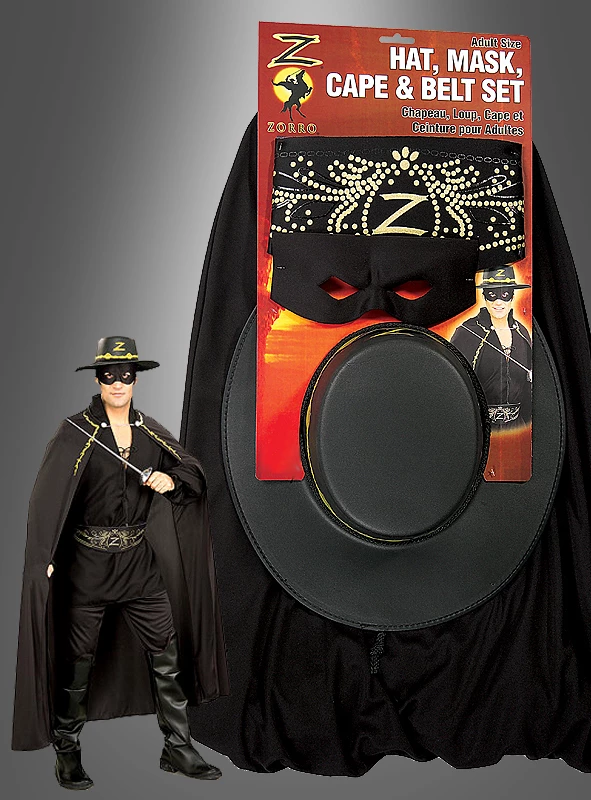 Mit diesem Zorro Kostüm Zubehör Set verwandeln Sie sich im Nu in den edlen Rächer, dem die Frauen zu Füßen liegen. Sie erhalten einen Hut mit einem leuchtenden Z , damit jeder gleich weiß, mit wem er es zu tun hat! Die gelbe Borte bildet einen schönen Kontrast zum eleganten Schwarz der stilechten Kopfbedeckung. Der golden akzentuierte Gürtel ist aus weichem Schaumstoff und wird hinten gebunden. Natürlich bekommen Sie auch das unverzichtbare Cape, das Ihr Zorro Kostüm erst komplett macht. Das kleine Goldkettchen, das zum Verschließen benötigt wird, harmoniert mit den restlichen Teilen an diesem Zorro Kostüm. Was fehlt noch zu einem stilechten Zorro? Natürlich die Augenmaske, denn niemand darf erfahren, wer Sie eigentlich sind. Tragen Sie schwarze Kleidung unter diesem Halloween Zorro Kostüm Set und verteidigen Sie die Gerechtigkeit!
